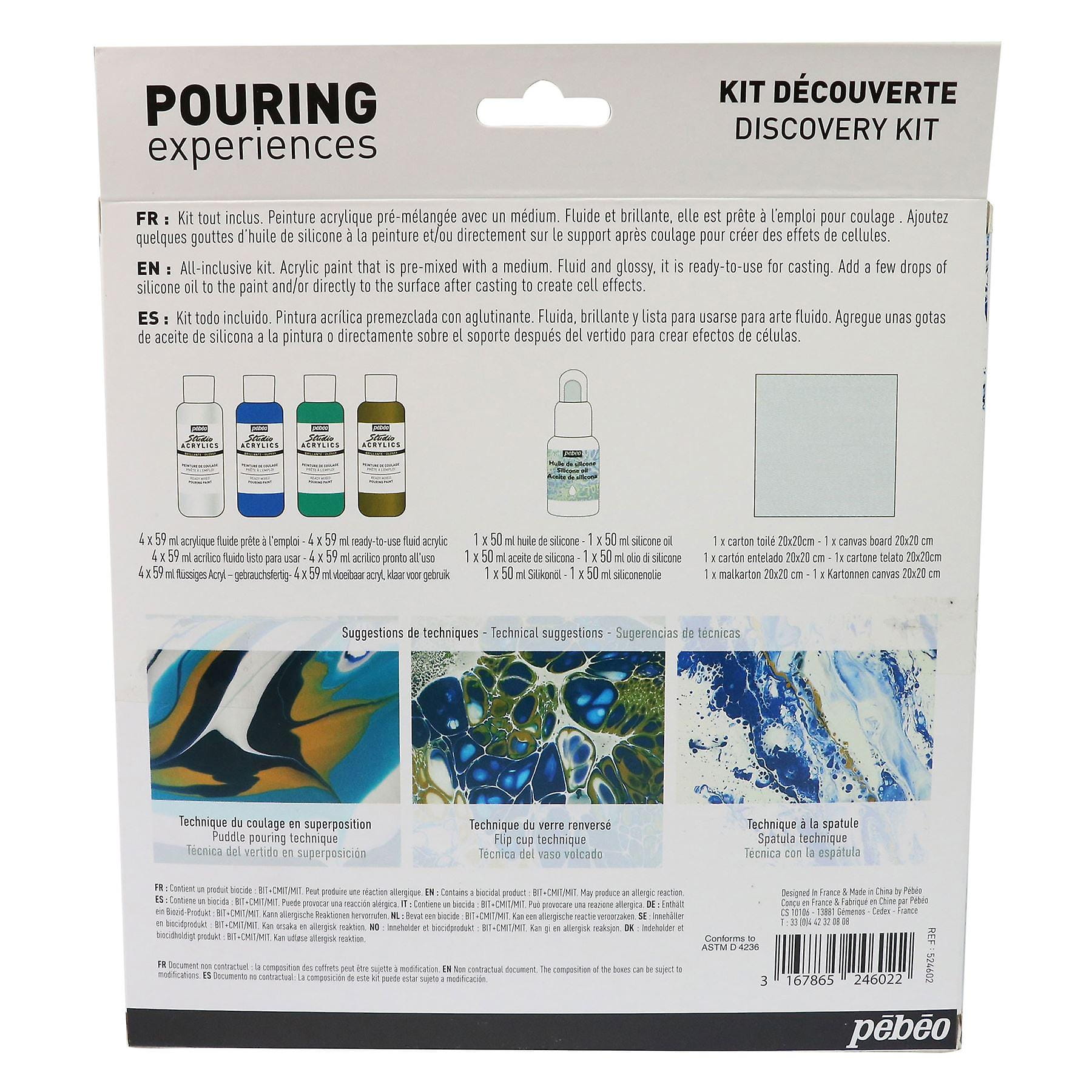 Zestaw zawiera płynną i błyszczącą farbę akrylową, która jest wstępnie zmieszana z medium. Zawartość zestawu: 4 x 59ml gotowych do użycia akrylów (złoty, turkusowy, niebieski i tytanowa biel). 50ml olejek silikonowy i płótno 20x20cm.
