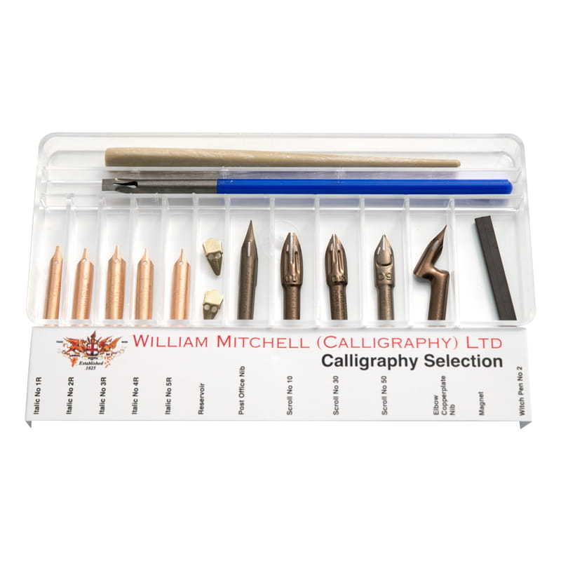 Zestaw kaligraficzny Williama Mitchella zawiera różnorodne stalówki do kursywy (Italic), pisma przewijanego (Scroll), pisma ozdobnego (Copperplate).